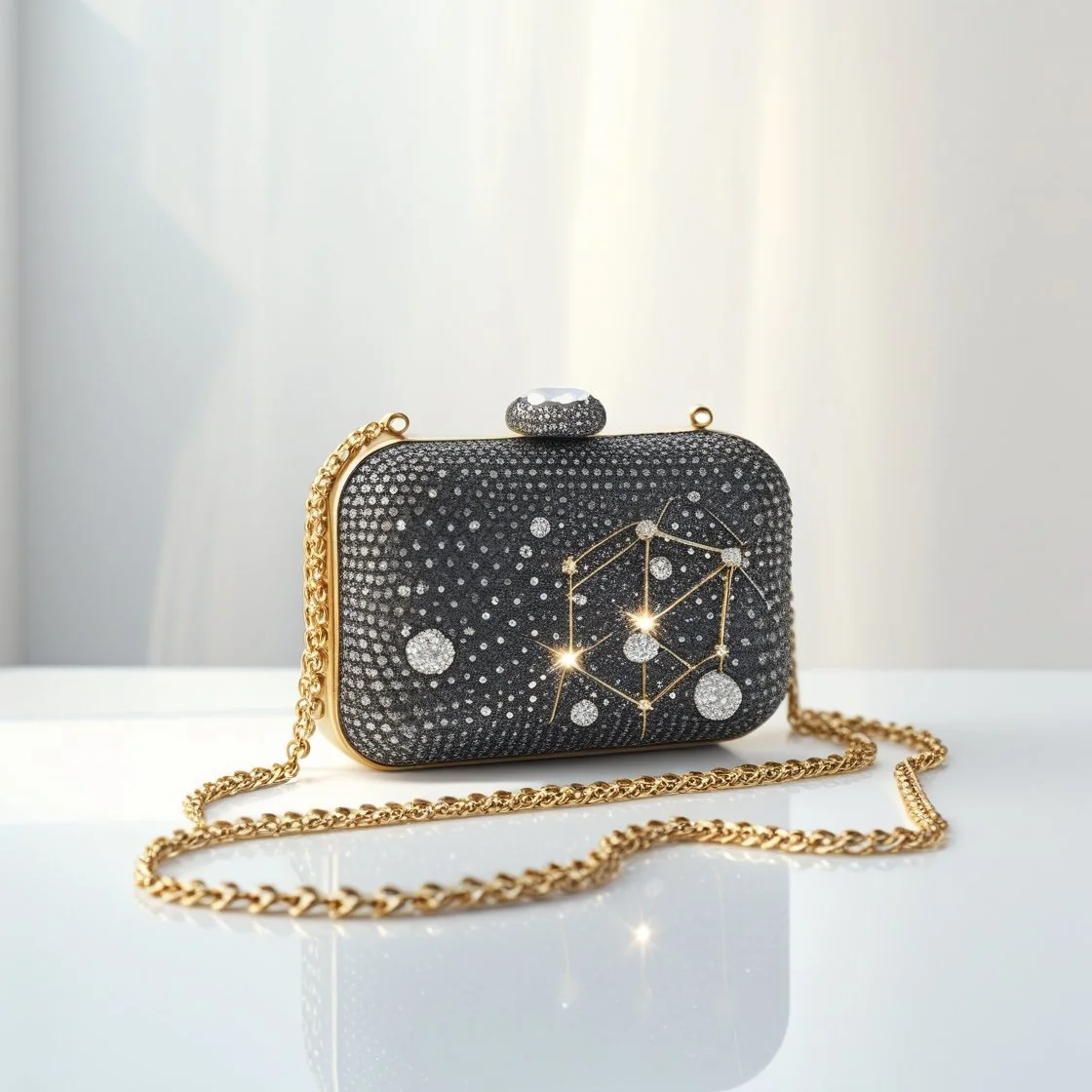 A galaxy of gems in the palm of your hand — introducing Stellaria, where minaudieres become constellations.” Inspired by the sun, the moon, the stars — and the mythologies that surround them — Stellaria exists between epochs: ancient and futuristic, classic and couture. Whether honoring the radiant energy of a solstice sunrise or the hypnotic arc of a planetary ring, each minaudière is a starlit artifact meant to be carried like a talisman.